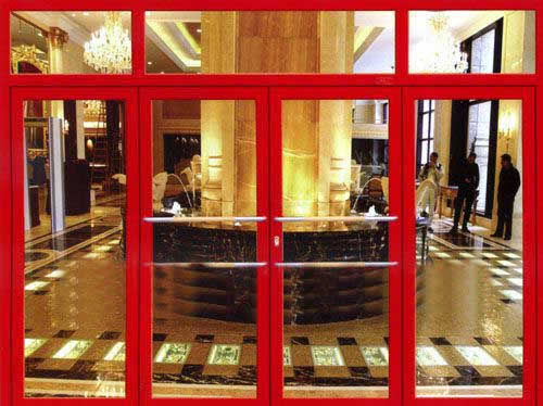 肯德基門主要由門框、門扇、門體玻璃、大拉手、大鉸鏈、閉門器等組成。該門型均可安裝于室內(nèi)和室外。每樘門有兩個門扇,左門扇、右門扇。門扇厚度40-60mm。 門扇一邊的邊框與門框之間由大鉸鏈連接,門扇另一邊門邊框上安裝有扳動式上下插銷,門扇頂部橫梁一側(cè)安裝有閉門器與門框連接。門體大鉸鏈采用底部螺栓旋緊方式,美觀大方,經(jīng)久耐用。門扇中間部分可增加橫撐,美觀的同時也方便行人出入。門扇玻璃為鋼化玻璃,門體安裝不銹鋼拉手,美觀且方便行人出入?!〔牧喜糠郑骸¢T扇外框采用高強鋁合金型材拼接而成,表面電泳處理 ,顏色可選。