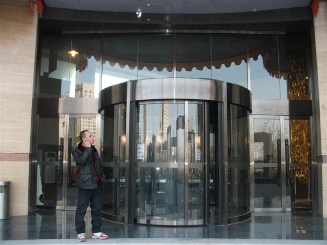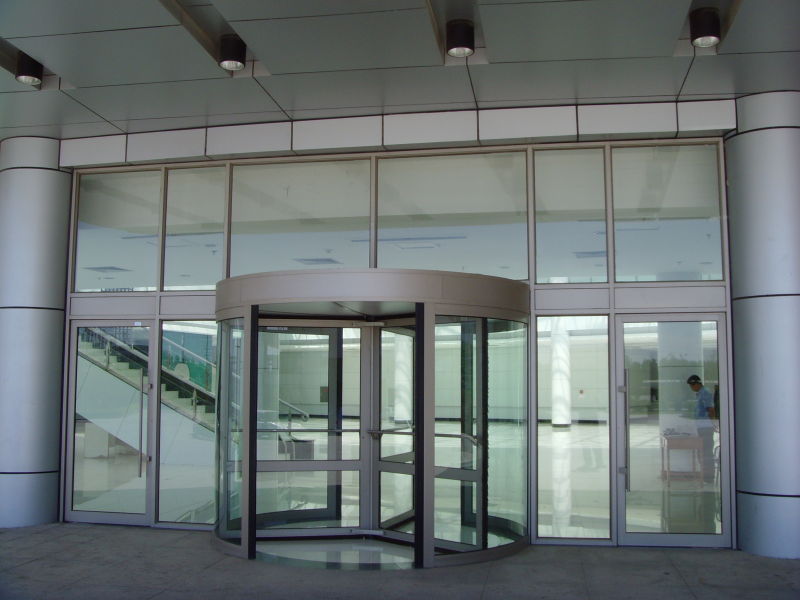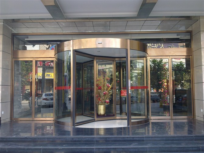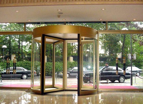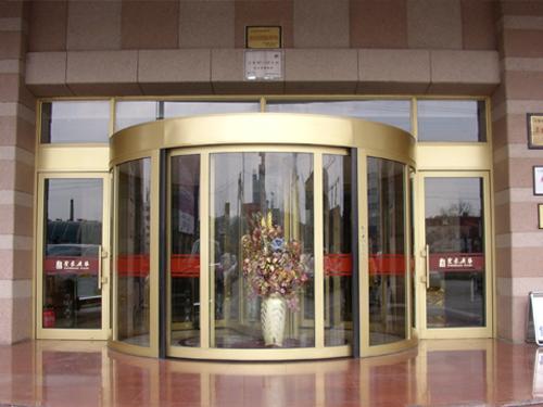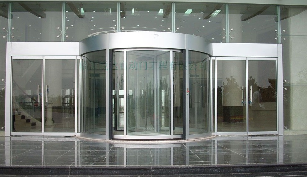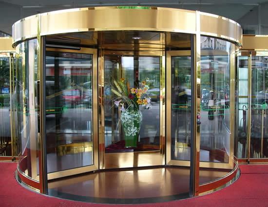 自動旋轉門由固定框架、帽頭、貼地包邊、邊墻玻璃組成旋轉門的外框,中間的展臺和門扇為旋轉部分。自動旋轉門由程序邏輯控制器(PLC)、計算機中心處理裝置(CPU)和調(diào)速電路等控制器件所組成的微電腦控制系統(tǒng)進行控制,門的運行完全自動門、特殊情況下才進行手動操作。鋁型材和鋼材框架全部外飾有不銹鋼、氟碳噴涂等,天棚吊頂采用鋁塑板,顏色由客戶選定,經(jīng)裝飾后的旋轉門顯得格外華麗壯觀。