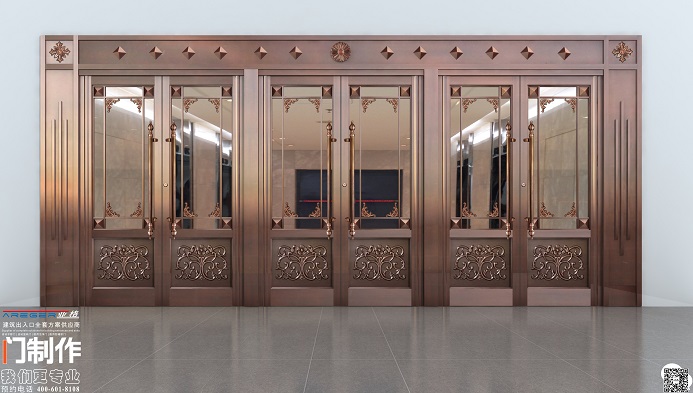 美觀性:銅門之所以受人喜愛,很大程度上與其精美的裝飾工藝有關(guān),精美的銅工藝用在銅門上,主要是一些經(jīng)過(guò)浮雕、鏤空、鍛打后的花紋和吉祥圖案。